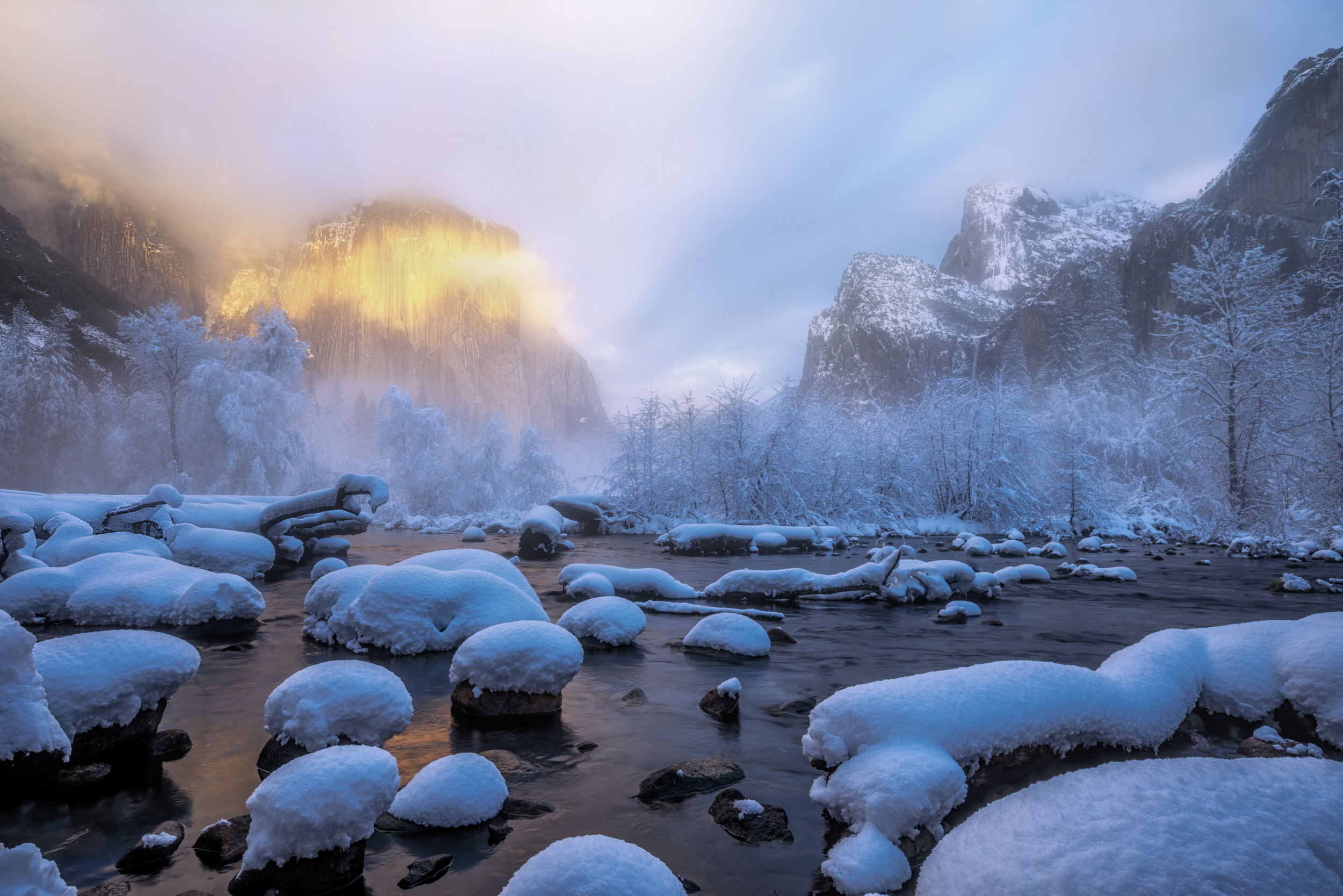 Luckily, winter of 2022 presented an exceptional opportunity. Several substantial snowstorms graced the region. Seizing the moment, I joined fellow photographers during one of these storms and reached the valley before the snowfall subsided. The trees lining the riverbanks and the rocks in the water were adorned with a fresh layer of glistening snow—an embodiment of the winter scene I had envisioned and longed to capture.